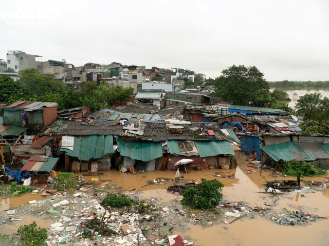 Khu vực Chương Dương Độ ven sông Hồng nước dâng lên ngập đường, người dân tuy khó khăn trong sinh hoạt và đi lại nhưng vẫn bình tĩnh chờ đợi thông tin lũ lên.
