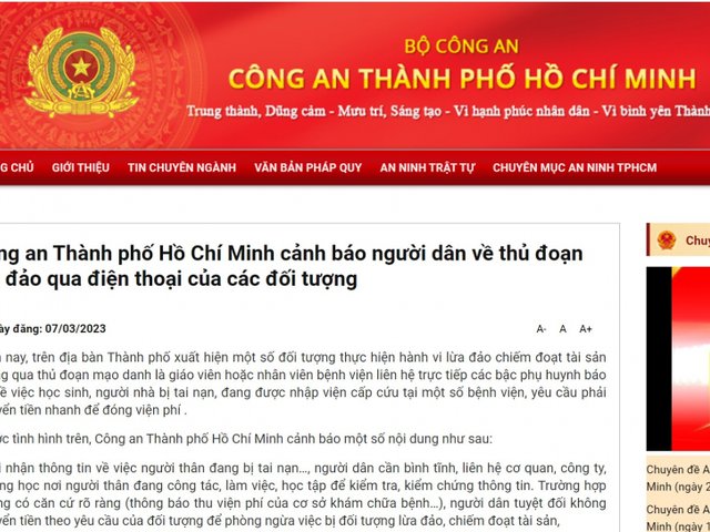 Chiều 7/3, Công an TP Hồ Chí Minh cho biết hiện nay, địa bàn thành phố xuất hiện một số đối tượng thực hiện hành vi lừa đảo chiếm đoạt tài sản thông qua thủ đoạn mạo danh giáo viên hoặc nhân viên bệnh viện liên hệ trực tiếp các bậc phụ huynh báo tin về việc học sinh, người nhà bị tai nạn, yêu cầu phải chuyển tiền nhanh để đóng viện phí.