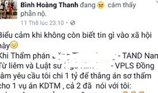 Tòa án nhân dân thành phố Hà Nội vừa có văn bản đề nghị Công an thành phố Hà Nội điều tra, làm rõ thông tin trên mạng xã hội tố cáo luật sư móc nối thẩm phán 'chạy án' nhiều tỉ đồng tại Hà Nội.