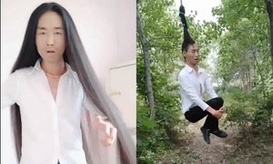 Mái tóc dài hơn 1 mét của chàng trai không chỉ suôn thẳng mà còn đủ khỏe để nâng toàn bộ trọng lượng cơ thể.
