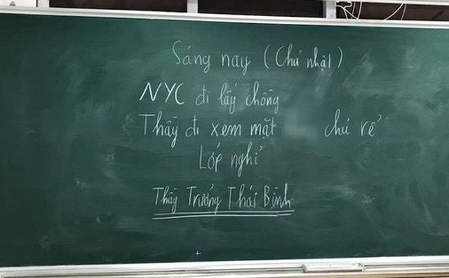 Một thầy giáo bá đạo đã cho cả lớp nghỉ học thêm với lí do rất bất ngờ: Đến đám cưới người yêu cũ để xem chú rể là ai. Bức ảnh chụp lại tấm bảng với lời nhắn gửi của người thầy được chia sẻ khắp các group và trang mạng xã hội.