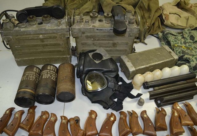 Kiểm tra hành lý một hành khách tại sân bay, cơ quan chức năng phát hiện có 79 bộ báng súng ngắn (mới 100%), 2 máy truyền tin dùng trong quân sự, 1 mặt nạ phòng độc và một số vũ khí, quân trang...
