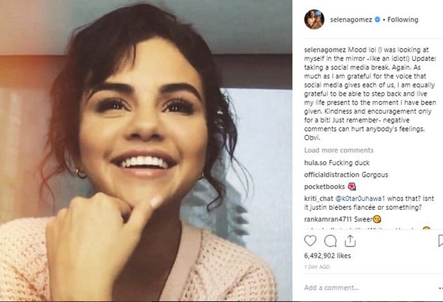 Sau khi xóa bức ảnh hơn 10 triệu lượt thích trên Instagram, mới đây Selena Gomez tuyên bố ngưng sử dụng mạng xã hội một thời gian.