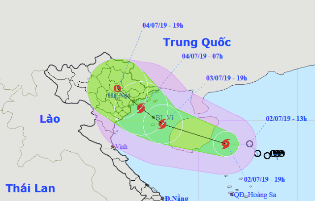 Dự báo sáng 4/7, tâm bão ở vùng ven biển các tỉnh Quảng Ninh - Ninh Bình, sức gió mạnh nhất 75 km/giờ, đạt cấp 8.