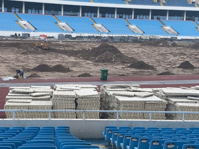 Công trường cải tạo sân Mỹ Đình đang gấp rút thi công, toàn bộ cỏ cũ bị bóc dỡ và nền sân được xử lý kỹ lưỡng trước khi phủ thảm cỏ hiện đại như sân Old Trafford.