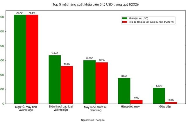 Theo Cục Thống kê, trong quý I/2026 có 20 mặt hàng đạt kim ngạch xuất khẩu trên 1 tỷ USD, trong đó 5 mặt hàng xuất khẩu đạt trên 5 tỷ USD.