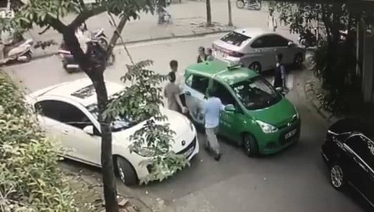 Chiếc ô tô đi trước chắn lối của chiếc taxi, người lái xe phía trước xuống xe cãi cọ rồi cầm gạch đánh liên tiếp vào đầu tài xế taxi mặc cho người dân can ngăn.
