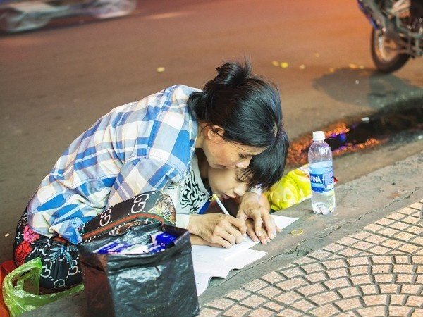 Hình ảnh mẹ cầm tay con dạy từng nét chữ bên lề đường gây xúc động mạnh