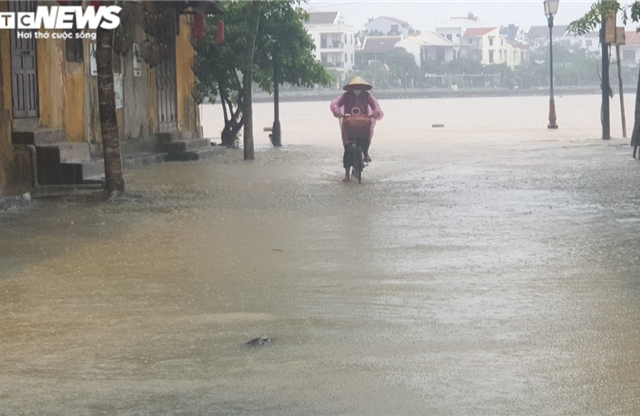 Thầy giáo khiêng xe máy băng qua nước lũ đến trường