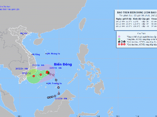 Thông tin từ Trung tâm dự báo khí tượng thủy văn Quốc gia, hồi 4h ngày 24/12, vị trí tâm bão số 10 ở vào khoảng 11,5 độ Vĩ Bắc; 112,0 độ Kinh Đông, trên vùng biển phía Tây Nam khu vực Giữa Biển Đông. Sức gió mạnh nhất vùng gần tâm bão mạnh cấp 8 (62-74km/h), giật cấp 10; di chuyển theo hướng Tây, tốc độ 5-10km/h.