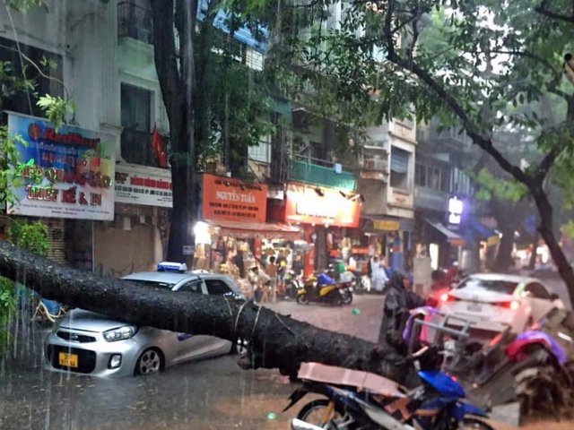 Cơn mưa lớn kéo dài khiến một cây cổ thụ bất ngờ bật gốc đổ ngang đường, đè vào ô tô trên phố Hàng Chiếu (Hà Nội) khiến giao thông toàn phố ùn tắc.