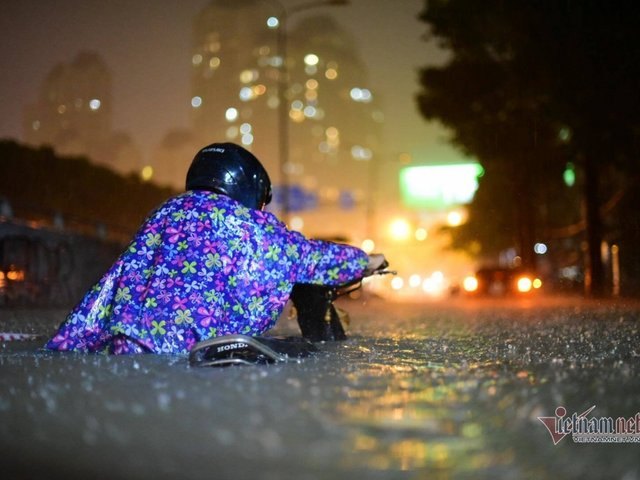 Cơn mưa lớn tối ngày 27.5 khiến nhiều tuyến đường ở quận Thủ Đức chìm trong biển nước. Trong đó, khoảng một km đường Tô Ngọc Vân, đoạn qua phường Linh Đông (quận Thủ Đức) nước ngập gần hết bánh xe máy. Người dân bì bõm lội nước, dắt xe chết máy.