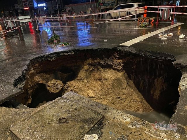 Sau trận mưa lớn nhiều giờ, mặt đường ở ngã tư Nguyễn Oanh - Phan Văn Trị (phường 10, quận Gò Vấp, TP.HCM) sụp lún sâu.