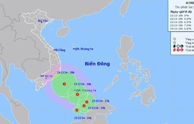 Cơ quan khí tượng cho biết, áp thấp nhiệt đới giật cấp 8 hình thành trên Biển Đông vào sáng nay 21/12, hầu như ít di chuyển, miền Trung mưa xối xả vào tuần tới.