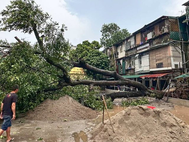 Hà Nội mưa lớn kèm dông lốc, cây cổ thụ và trụ đèn giao thông đổ la liệt