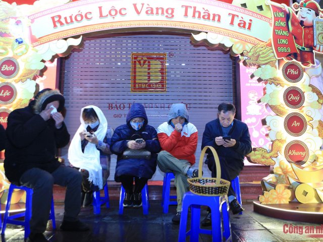 Sáng sớm 7/2 (tức ngày 10 tháng Giêng Âm Lịch) là ngày Vía Thần tài. Dù thời tiết có mưa và khá lạnh nhiều người dân Hà Nội vẫn xếp hàng đi mua vàng lấy may.