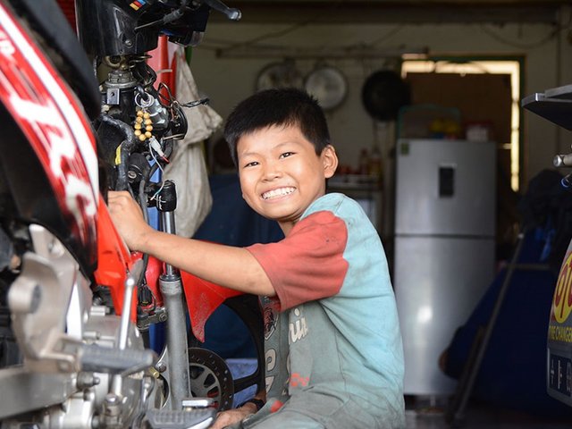 12 tuổi, Hữu Bằng đã sửa xe thoăn thoắt như một người thợ lành nghề. Nhìn vẻ lanh lợi, đặc biệt là nụ cười tươi rói, chẳng ai nghĩ cậu bé ấy đã gánh trên mình một tuổi thơ bất hạnh và đang khao khát được đến trường.