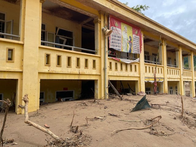 Bão số 3 đi qua, trường Mỹ Lý chìm trong trong bùn đất, thầy hiệu trưởng nén nước mắt đi xin từng tấm chăn, chiếc ghế để sớm đón học sinh trở lại trường.
