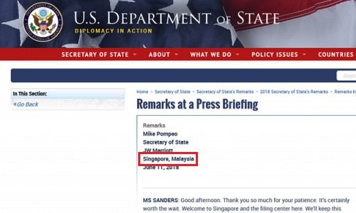 Nhiều người Singapore và Malaysia giận dữ khi Bộ Ngoại giao Mỹ mắc sai sót trong tài liệu liên quan tới hội nghị thượng đỉnh Mỹ - Triều.