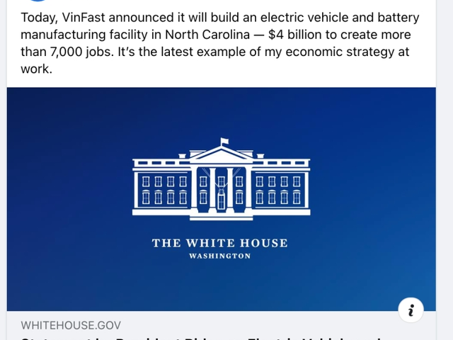 Facebook của Tổng thống Biden chào đón Vinfast đầu tư nhà máy xe điện ở Mỹ