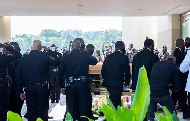 Các cảnh sát Mỹ đứng thành hai hàng và giơ tay chào, thể hiện sự kính trọng, khi linh cữu của George Floyd được đưa vào nhà thờ tại Houston.