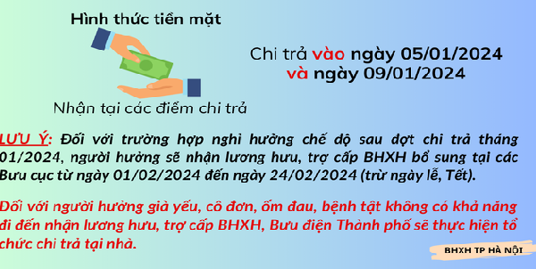 Bảo hiểm xã hội Hà Nội sẽ chi trả gộp lương hưu tháng 1, 2 năm 2024 vào cùng 1 kỳ chi trả lương hưu tháng 1/2024.