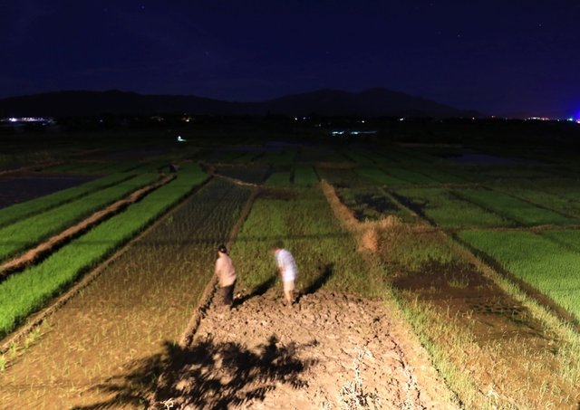 Nhiều nông dân ở ngoại thành Hà Nội phải đeo đèn pin đi cấy từ 2h sáng để kịp xong việc trước khi mặt trời lên cao.