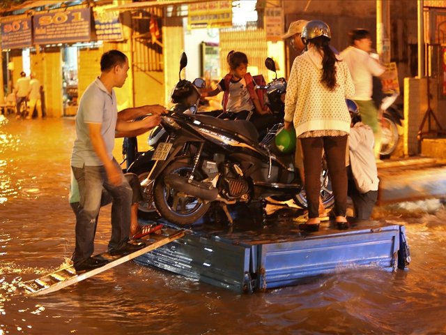 Cứ mỗi tháng 2 lần triều cường, người dân sống dọc đường Lê Văn Lương (huyện Nhà Bè, TPHCM) lại chịu cảnh khốn khổ vì ngập. Ngoài đường thì nước bẩn ngập lút xe máy, trong nhà thì nước tràn ướt hết đồ đạc.