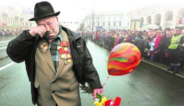 Bức ảnh người cựu binh già ngực đeo đầy huân chương bật khóc khi trong tay cầm những bông hoa đầy màu sắc gây xúc động cho hàng triệu người trên thế giới.
