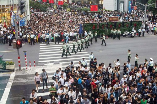 Đám đông chen chân đổ xuống đường dịp Quốc khánh Trung Quốc khiến cảnh sát phải đứng ra làm barrier điều tiết giao thông.