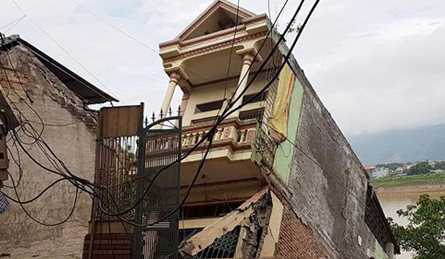 9 ngôi nhà đổ sập xuống sông Đà sau vụ sạt lở xảy ra tối qua, 30.7, tại tổ dân phố 25 và 26 phường Đồng Tiến (TP Hoà Bình, tỉnh Hoà Bình), trong khi nhiều ngôi nhà khác đang chực chờ sập đổ.