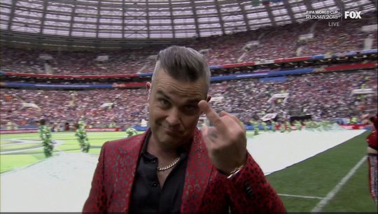 Nam ca sĩ người Anh Robbie Williams, 44 tuổi, đã trở thành tâm điểm của lễ khai mạc World Cup 2018 khi đưa ngón tay thối về phía camera.