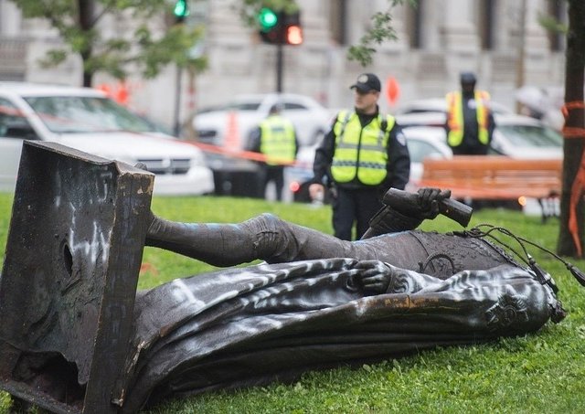Người biểu tình kéo đổ tượng John Macdonald, thủ tướng đầu tiên của Canada, ở trung tâm thành phố Montreal.
