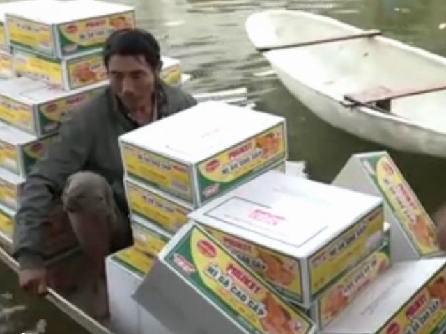 Bị cô lập trong nước lũ đã một tuần, người dân vùng ven Hà Nội được cứu trợ mì tôm, sữa để chống đói.