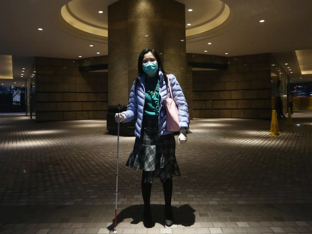 Một tay cầm gậy, tay kia vươn ra để tìm đường, Jess Shek Kinh-chong lo lắng sẽ nhiễm virus corona khi đi lại hàng ngày.