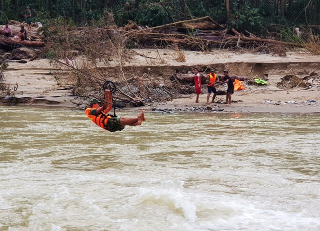 Cây cầu bị cuốn trôi, nước sông Leng chảy xiết nên lực lượng tìm kiếm dùng ròng rọc đi qua để tìm kiếm người mất tích.