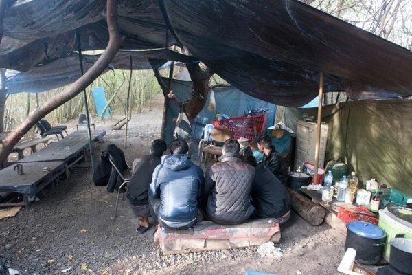 Quây tròn lại với nhau trong một túp lều dựng tạm giữa một khu rừng đầy bùn đất, những người đàn ông này đang chờ đợi cơ hội để có một cuộc sống mới.