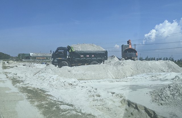 Cuối tháng 7 đầu tháng 8/2021, chúng tôi về xã Quảng Công, huyện Quảng Điền (Thừa Thiên-Huế), dọc tuyến QL49B đi qua địa bàn xã này có rất nhiều đụn cát lớn hàng trăm mét khối cát trắng ở bên đường.
