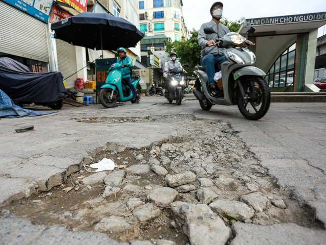 500m vỉa hè đường Nguyễn Xiển (quận Thanh Xuân, Hà Nội) "nát tươm" do hàng ngày phải gồng gánh lượng lớn xe cộ di chuyển vào giờ cao điểm.