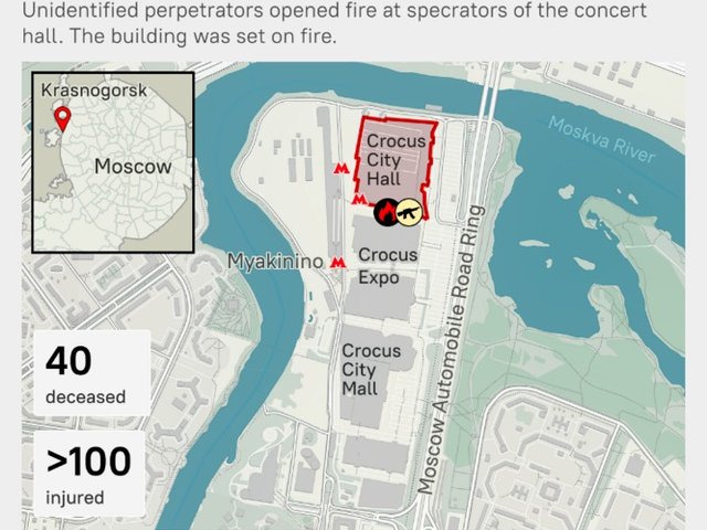 Ít nhất 40 người đã thiệt mạng và hơn 100 người bị thương trong vụ tấn công khủng bố tại trung tâm mua sắm và tổ hợp hòa nhạc Crocus City Hall, phía tây bắc Moskva.