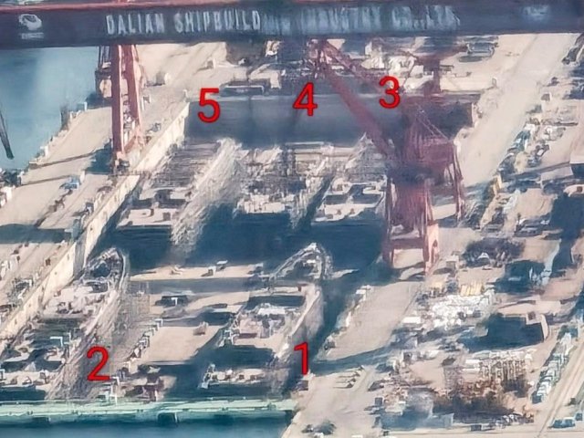 Các hình ảnh đăng tải trên mạng xã hội Weibo cho thấy 5 tàu khu trục đang được đóng đồng thời tại một nhà máy ở Trung Quốc.