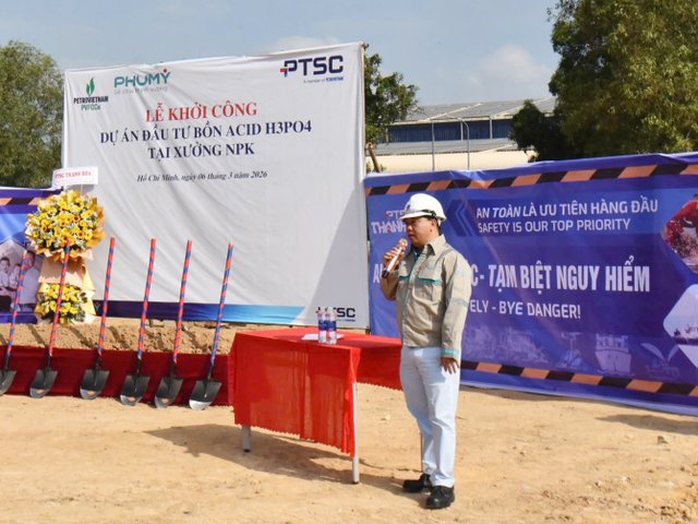 Vừa qua, tại khu tổ hợp Nhà máy Phú Mỹ (TP HCM), Tổng công ty Phân bón và Hóa chất Dầu khí (PVFCCo - Phú Mỹ) - đơn vị thành viên của Tập đoàn Công nghiệp - Năng lượng Quốc gia Việt Nam (Petrovietnam) đã phối hợp với nhà thầu Tổng công ty CP Dịch vụ Kỹ thuật Dầu khí Việt Nam (PTSC) tổ chức Lễ khởi công dự án đầu tư bồn nguyên liệu Acid Phosphoric (H3PO4).