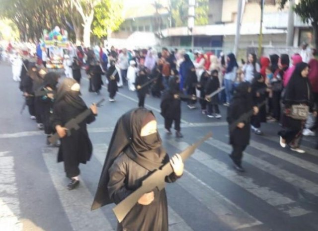 Một nhà trẻ ở Indonesia đang khiến công chúng phẫn nộ khi cho trẻ em mặc quần áo theo phong cách chiến binh Nhà nước Hồi giáo tự xưng (IS) ôm súng diễu hành trên phố.
