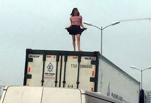 Người phụ nữ nhảy múa trên nóc xe container ở Hà Nội