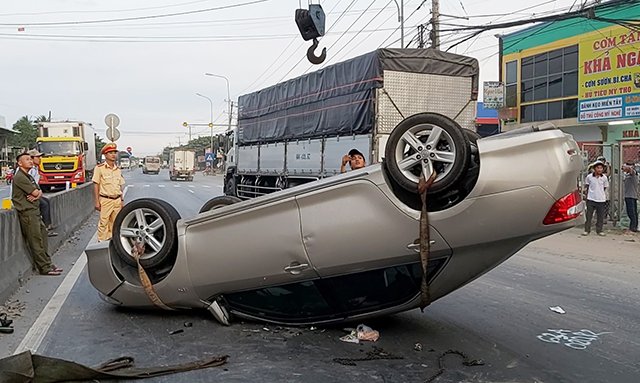 Xe con lật ngửa trên QL1A, nhiều người may mắn thoát nạn