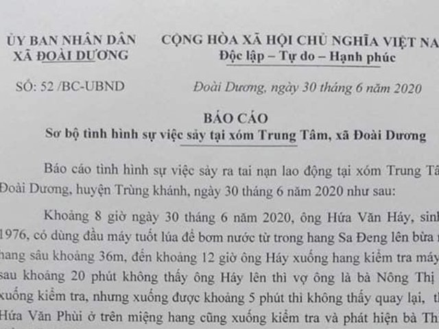 Khi xuống hang sâu ở xã Đoài Hương (huyện Trùng Khánh, tỉnh Cao Bằng) để cứu người đàn ông mắc kẹt, 2 người đã tử vong, nhiều người ngộ độc do ngạt khí.