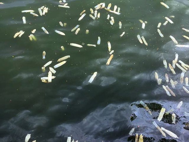 Nhiều người dân giật mình khi chứng kiến cảnh hàng trăm chiếc bao cao su đã qua sử dụng nổi trắng một góc hồ Tây quận Tây Hồ, Hà Nội.