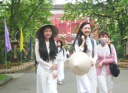 Nữ sinh Huế mặc áo dài, đội nón lá trong lễ khai giảng