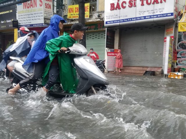 Nước chảy cuồn cuộn trên phố Sài Gòn sau cơn mưa 30 phút