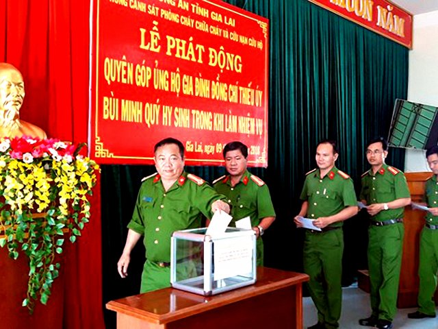 <p><strong>Lực lượng Cảnh sát Phòng cháy chữa cháy và Cứu nạn cứu hộ (Công an tỉnh Gia Lai) vừa tổ chức quyên góp gần 200 triệu đồng ủng hộ gia đình chiến sỹ hy sinh khi làm nhiệm vụ.</strong></p>